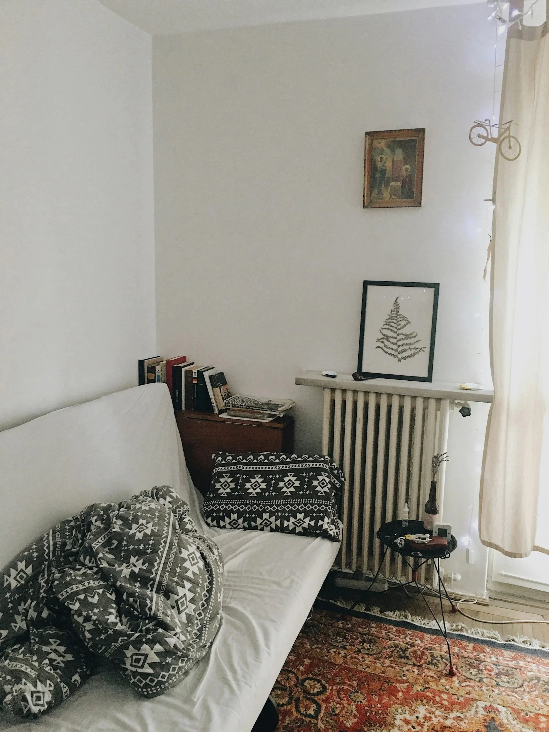 • A cozy living room corner with a white sofa, a black and white patterned blanket and cushion, a small wooden side table with books and magazines, a radiator with framed artwork resting on top, a small round black table with electronic devices, a vase with dried flowers, a curtain covering a window or door, and a patterned rug on the floor.
